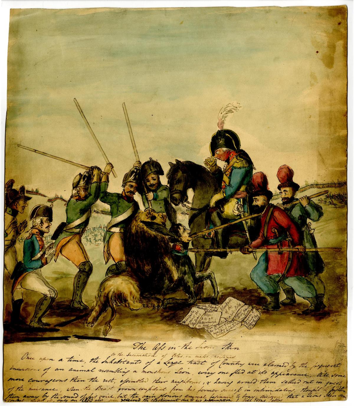 Lt. Col Thomas Braddyll drew the following image in the first decade of the 19th century. The goal was to study Napoleon through visualization of a fable entitled “The Ass in the Lion’s Skin,” in which the overall lesson dictates that words and actions are louder than appearances. In this image, Napoleon is the ass covered in lion’s skin with long ears has a military collar and stock, and with officers ram him with spears. This is to demonstrate how the people were tired of the war and unbelieving of Napoleon’s promises that he had or would continue to make until the war ended.