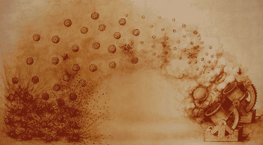 The front mortar is firing bombs that explode on impact into a cloud of metal shrapnel. The back mortar loaded with stones or small-caliber iron balls that are fired at the enemy like grape-shot.