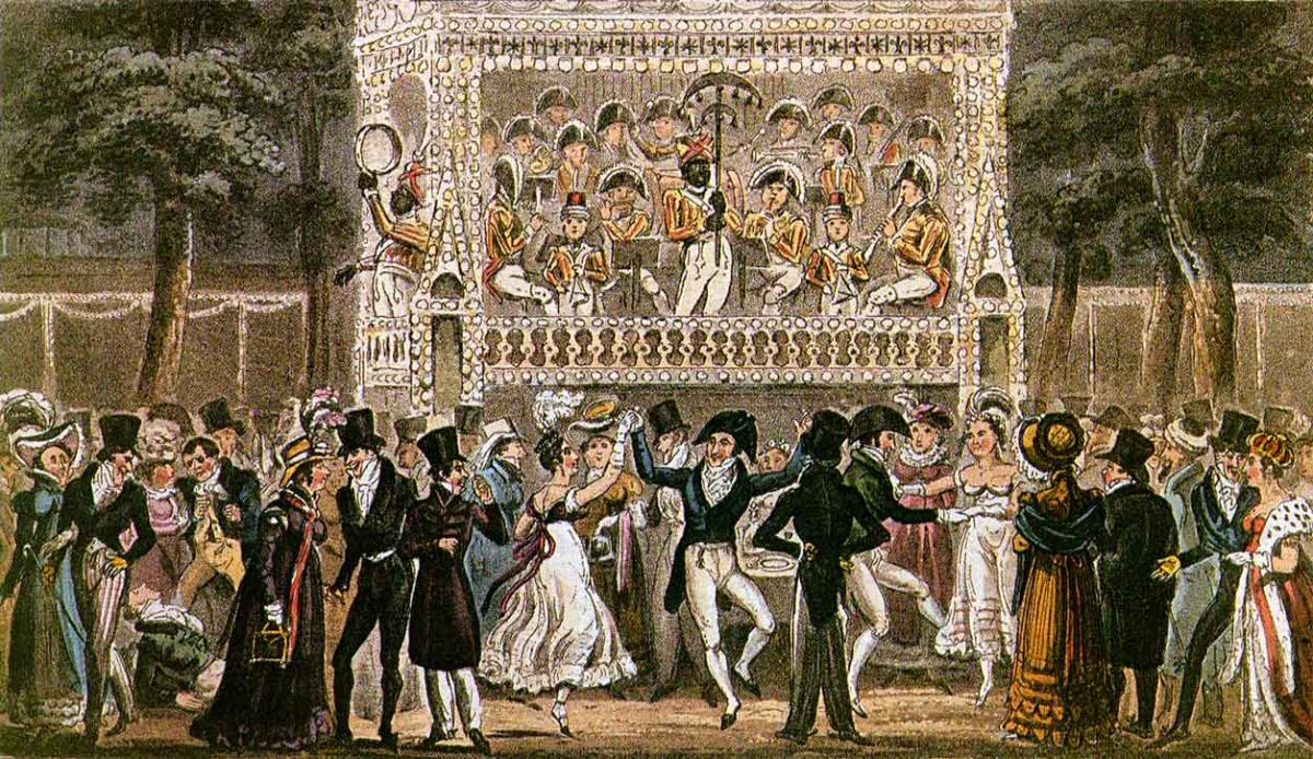 This image is Isaac Robert Cruikshank and George Cruikshank’s “Tom, Jerry, and Logic Making the Most of an Evening at Vauxhall.” This piece depicts a formal event at the Vauxhall Gardens in London and showcases the orchestra in the center of the illustration. Separate spaces for live musicians, such as the one shown in the image, were common during the Regency Era and were also present in the ballrooms at the public assembly rooms like the Bath Assembly Rooms and Almack’s. Music for each dance was chosen by the lady leading the set.