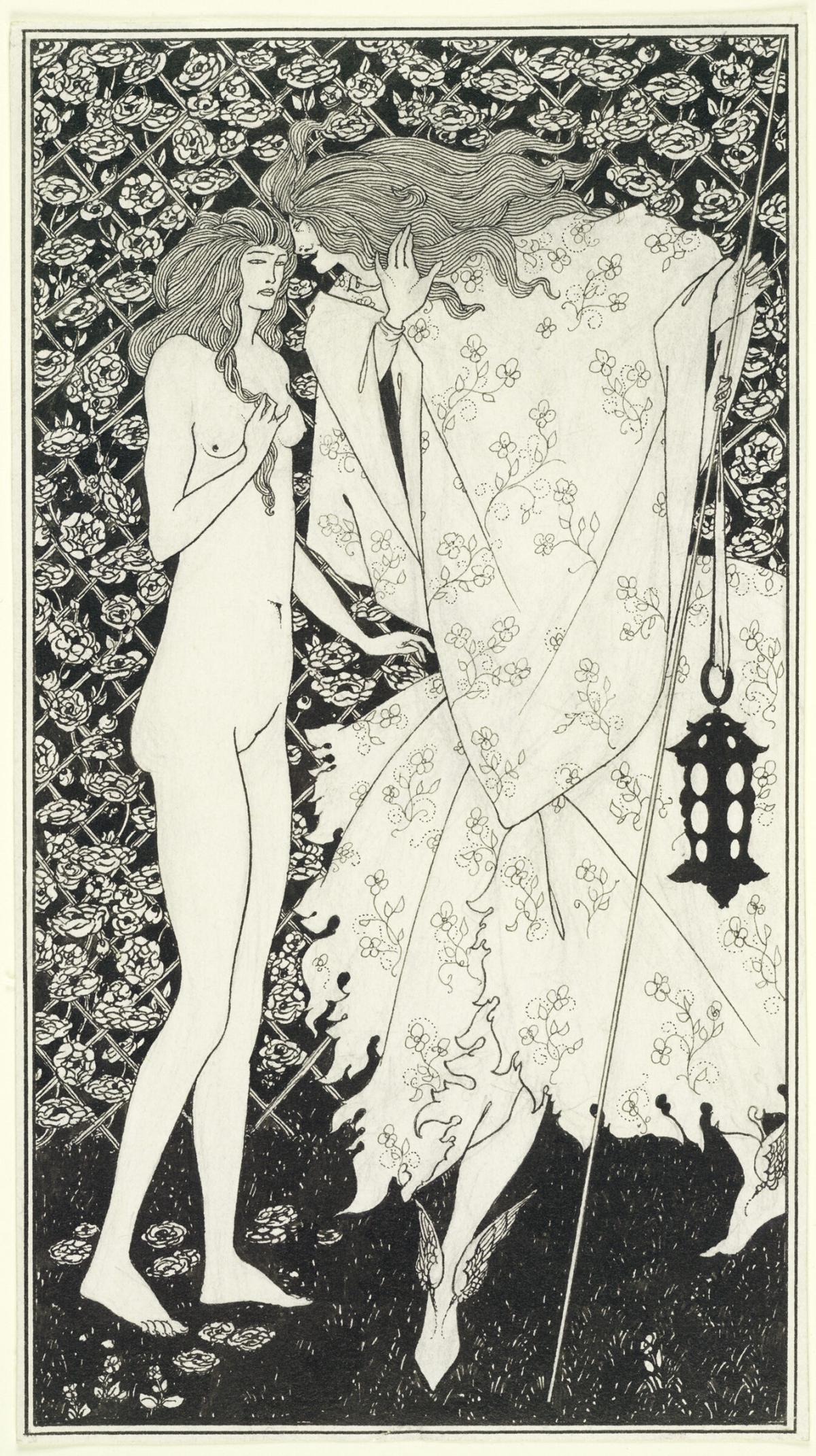 The two female figures appear to be mirror images of one another, suggesting a contemplative, symbolic, or fantastical interaction between them. The garden itself makes for a transitional area where imagination, or the unknown, and reality collide. Beardsley’s ability to depict the inexplicable is directly depicted in this piece, as he renders an intangible and otherworldly moment in visual form. The result is haunting, beautiful, and unsettling all at the same time.