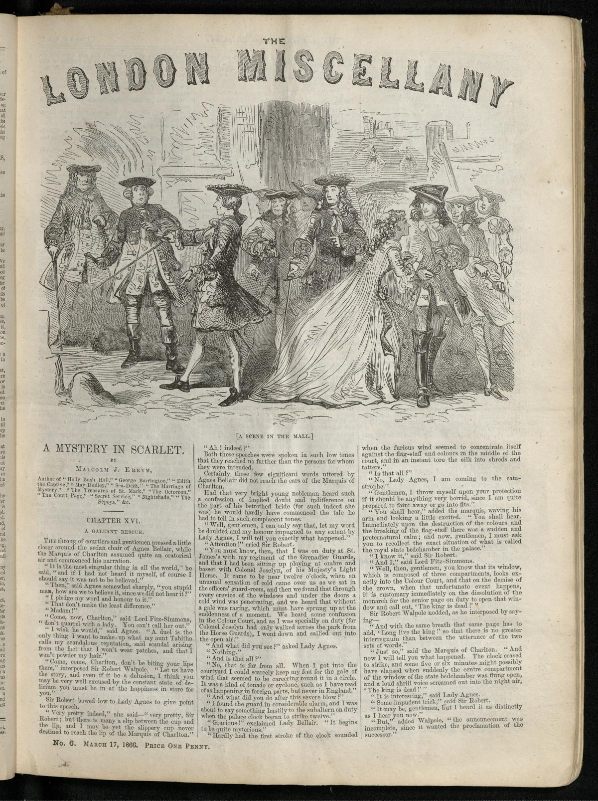 In the Mall, St. James society parades in its finery. At left, the highwayman Frank Bellair opposes his father General Sir Thomas Bellair. At right, Frank's sister Lady Agnes Bellair rebuffs the Marquis of Charlton. From The London Miscellany, no. 6 (17 March, 1866), 81. Wells Library copy. Image courtesy Lilly Library, Indiana University, Bloomington, Indiana.