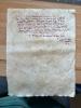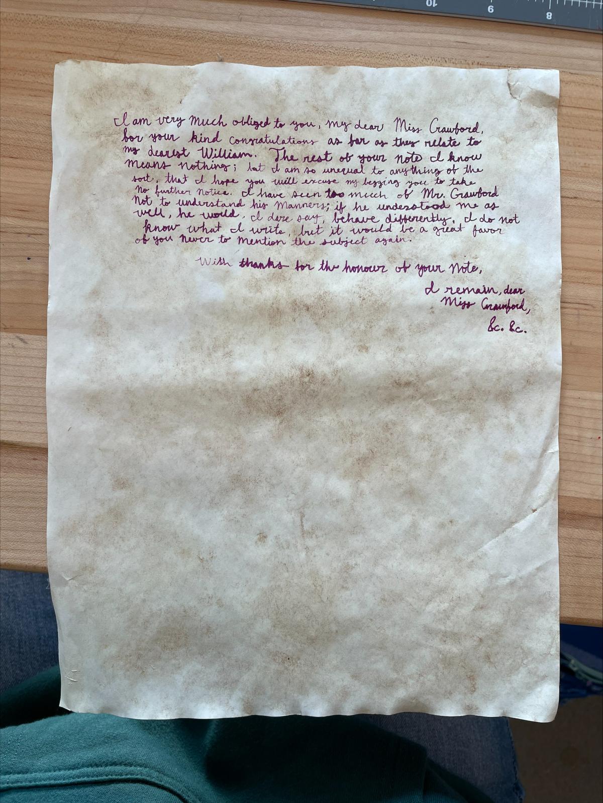 Recreation of Fanny Price's Letter to Mary Crawford, Volume II, Chapter XII, Mansfield Park (1814), by Jane Austen, crafted by Charlotte Mahn, 2023. This image shows the short letter on paper that has gained an antique-look through staining by tea bags. A classmate brought in this stained paper for the entire class, a very thoughtful gift for those trying to recreate the Regency-era letter. The dip pen was a clear spiral design that looked dipped in blood when I lifted it from the small bottle of ink. The letter was later folded and sealed with wax. Franny Price is a timid creature, and I imagine her almost crouching when she speaks to figures of authority in her life; thus, I wrote in smaller writing than I normally would have to embody someone who has little confidence. There is plenty of space left on the page once Fanny is done with her short response to Mary Crawford.
