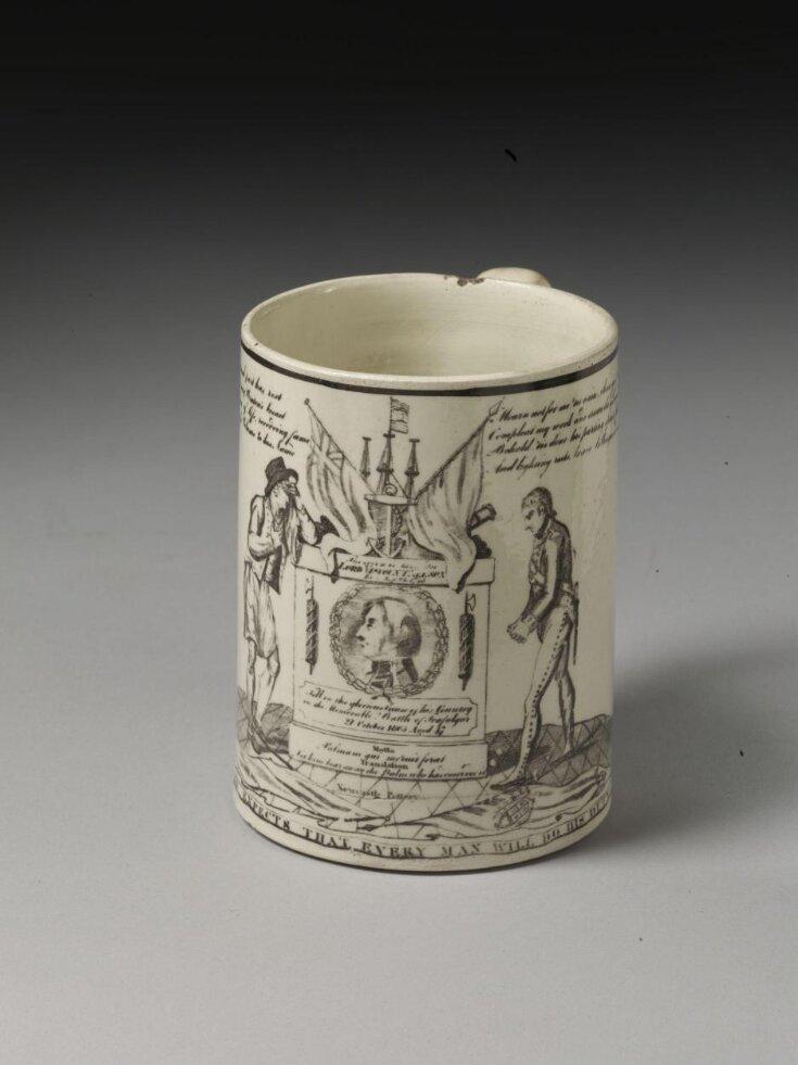 Created by Newcastle Pottery in Newcastle upon Tyne, a small English city in the northeast, this memorial mug in honour of Lord Nelson’s death followed a tradition of memorial pottery in the 19th century. Created in 1805, this mug marked the year Lord Nelson fell in battle and passed away fighting the Napoleonic war in the Battle of Trafalgar on the 21st of October. The mug depicts a soldier and a sailor standing on either side of a large memorial; engraved with a large bust of Lord Nelson atop an inscription and quotes that mark his passing. Reflecting the romantic ideals popularized at the time by poets such as William Wordsworth, this mug uses themes of remembrance and the narratives of grief and memorium, which citizens could understand and relate to. The strong naval representation on the mug also would have struck a chord with the British public, having been inundated with narratives of exploration and the sublime nature of the sea, such as Coleridge’s famous “Rime of the Ancient Mariner”. This fantastic beauty and terror of exploration that Coleridge describes, would have represented the work a navalman such as Lord Nelson, would have been doing, and helpinged citizens to feel closer to the experiences and appreciate the bravery of Lord Nelson in their remembrance. Nelson was an extremely popular figure in the 18th century and was a masthead for the navy, his victories gave the British hope in the Napoleonic war, and as such his death was something to be reckoned with throughout the entire country, down to the average citizen.