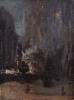 This painting depicts a night scene filled with fireworks, expressing dark tones and a sense of mystery. The painting uses somber colors to create an uneasy and ominous feeling, full of chaos. This atmosphere resonates with the theme of "The Macabre" as well as Edgar Allan Poe's poem, "The Raven". The atmosphere within "The Raven" is full of darkness as the narrator emphasizes themes of obsession and despair. The raven within the poem itself becomes a symbol of death and mourning, emphasizing the feeling of darkness within the poem and the painting.