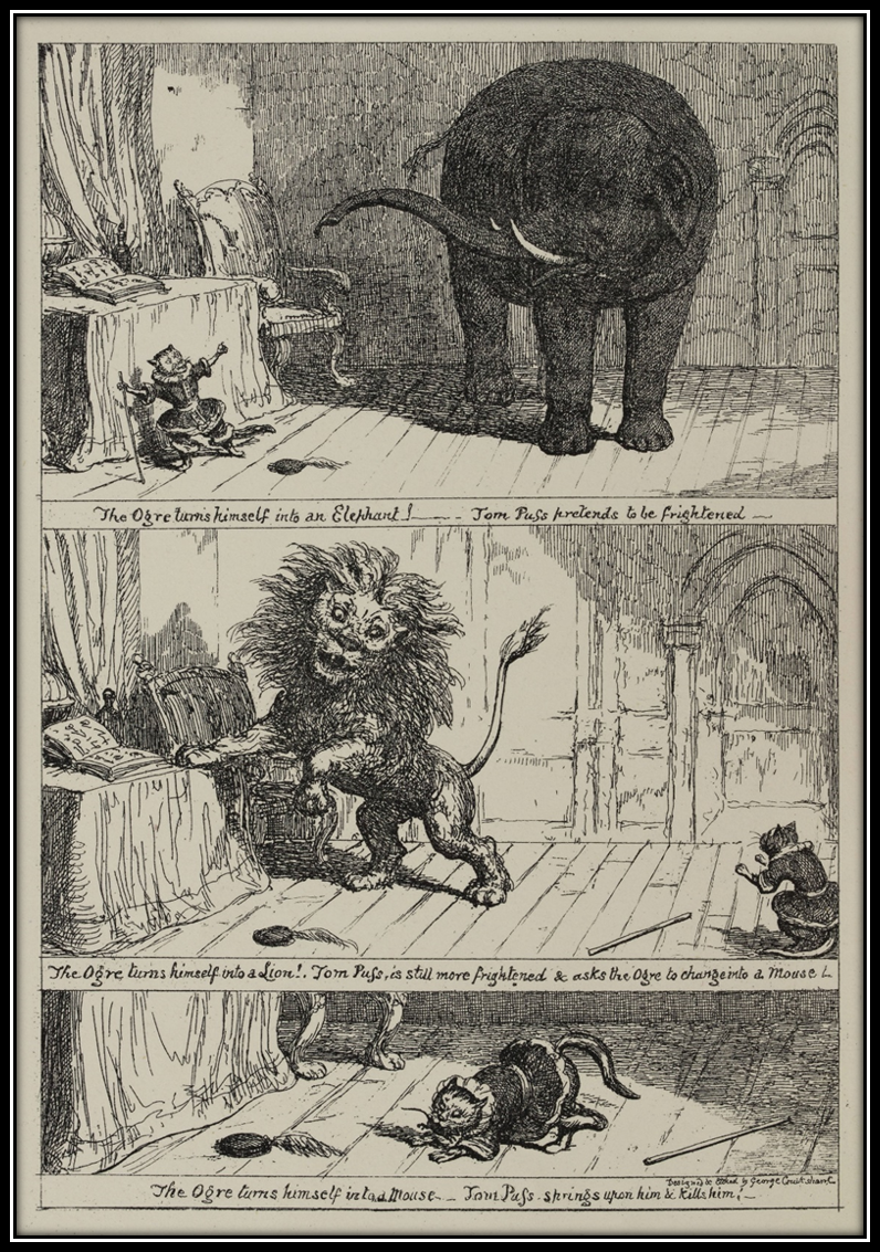 "The Ogre Turns Himself into a Mouse; Tom Puss Springs Upon Him & Kills Him" by George Cruikshank