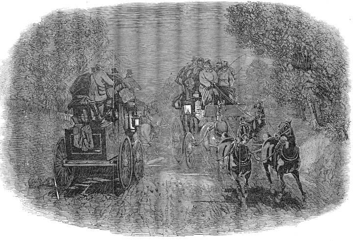 Picture of two old style mail coaches passing each other. http://www.victorianweb.org/periodicals/iln/75.html Featured in Exhibit Coaches and Carriages Date 6 Jan 1849 Artist Henderson Copyright ©http://www.victorianweb.org/periodicals/iln/75.html Vetted? No