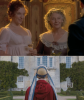 Comparing the two scenes in which Emma paints Harriet, you can see the difference in the costuming. In the 1996 film, Harriet is not wearing bright colors; she has a crown of leaves in her hair, but there are no flowers and little color in her look. She is being painted outside with natural scenery behind her. Mia Goth in her portrayal of Harriet, however, is dressed in elaborate costuming. She has color, not only in her dress, but in her hair as well. There are vibrant flowers and a beautifully painted background.