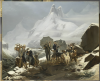 Created in 1824 by French artist Xavier Leprince this painting is titled "Paysage de Susten en Suisse". The title translates to mean "Landscape of Susten Switzerland" and it is currently on display in the Louvre Museum in Paris, France. It was purchased from the special collection of King Charles X in 1826 towards the end of the Romantic period. The piece was created with oil paints and is a remarkable example of the power landscape pieces have in conveying dynamic Romantic themes and concepts, such as the sublime, beautiful and picturesque. The painting depicts five individuals who have come to a stop while exploring a Swiss mountain pass. The mountainous background evokes sublime qualities such as obscurity, grandeur, and power. Yet, its overall detailed and smooth composition reflects qualities that are attended to when perceiving something beautiful. Furthermore, Leprince is able to capture the romantic allure and desire to travel and explore polar regions of the world. The individuals in the painting are portrayed to be enthralled in a moment of awe and wonder. Many assume that the man who is sitting on a rock drawing or writing within his notebook is a self-portrait of Leprince. The act of documenting either through drawing or writing furthermore evokes the romantic belief of travel being a means of acquiring self-knowledge and perspective about the world.