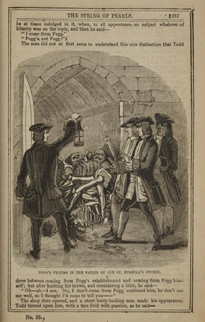 A group of officials discovered a secret grave in a vault underneath St. Dunstan's Church. These are the remains of victims of Sweeney Todd, and by the looks of it, Todd is what would be considered a serial killer. This image is a chilling reminder of the monster that is Sweeney Todd.