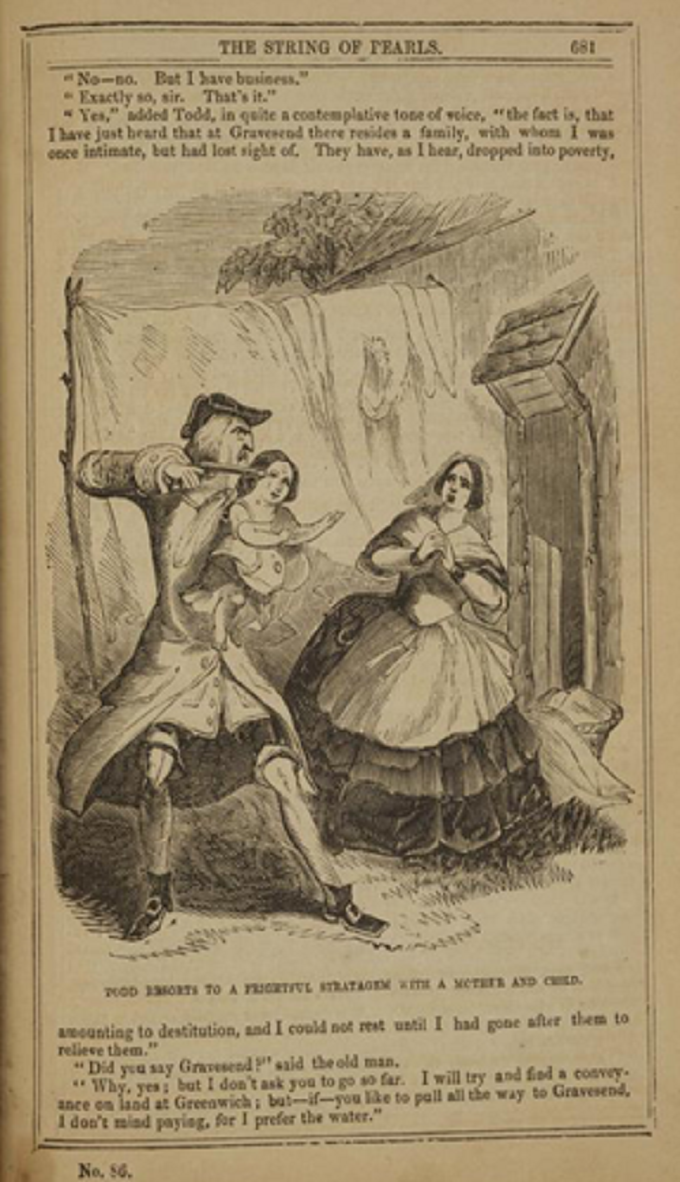 Todd is showing taking a child from a mother and holding it hostage with a gun. The child is in tears and reaching towards the mother. The mother is clearly shocked and at a loss for what to do. They were taken by surprise as indicated by the laundry hanging in the background, in addition to the basket of laundry that has either already been dried or was also going to be hung up. The fear portrayed in this image from the mother and child, coupled with the menacing glare from Todd capture how far Todd is willing to go to achieve his ends.