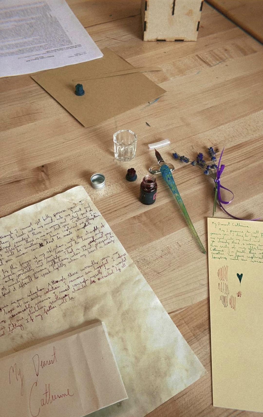 Letters play a crucial role in the novels of Jane Austen. Using dip pens and ink, students in EN 354R on "Jane Austen" recreated some of the critical letters from Austen's memorable novels and fan fiction to gain insight into Austen's characters and to rekindle the writing practices of the Regency era. Tea-stained paper, crinkled paper, and parchment paper helped to make the letters authentic. Students learned to fold their letters and seal them, Regency style. Critical crafting brought Jane Austen's time to life.