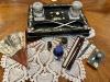 Arrangement of the Accoutrements of Writing, From the Personal Collection of Catherine J. Golden, Photo by Catherine J. Golden, 2023. These items, which date to the nineteenth century, demonstrate the lost art of letter writing. Moving clockwise, items include a papier-mâché desk set with glass ink wells holding two dip pens made of gold and ivory; a black metal blotter with gold floral decorations, which forms a set with a small black metal letter opener (included) and stamp box (popular post 1840 with the coming of the postage stamp, not shown); an additional dip pen in its original box with the owner's name written inside in ink; ink in black, navy, and gold; a lady's paper fan of the period.
