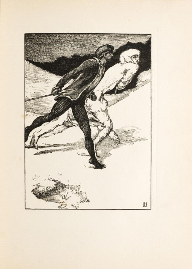 "The Race" is the fourth illustration in the 1896 version of The Were-Wolf, written by Clemence Housman and published by The Bodley Head. It is a wood engraving from a pen and ink drawing of Laurence Housman. "The Race" depicts the pursuit of White Fell through the woods by Christian as midnight approaches. Christian believes her to be a were-wolf and wants to kill her in her wolf form before she kills her next planned victim, Sweyn.
