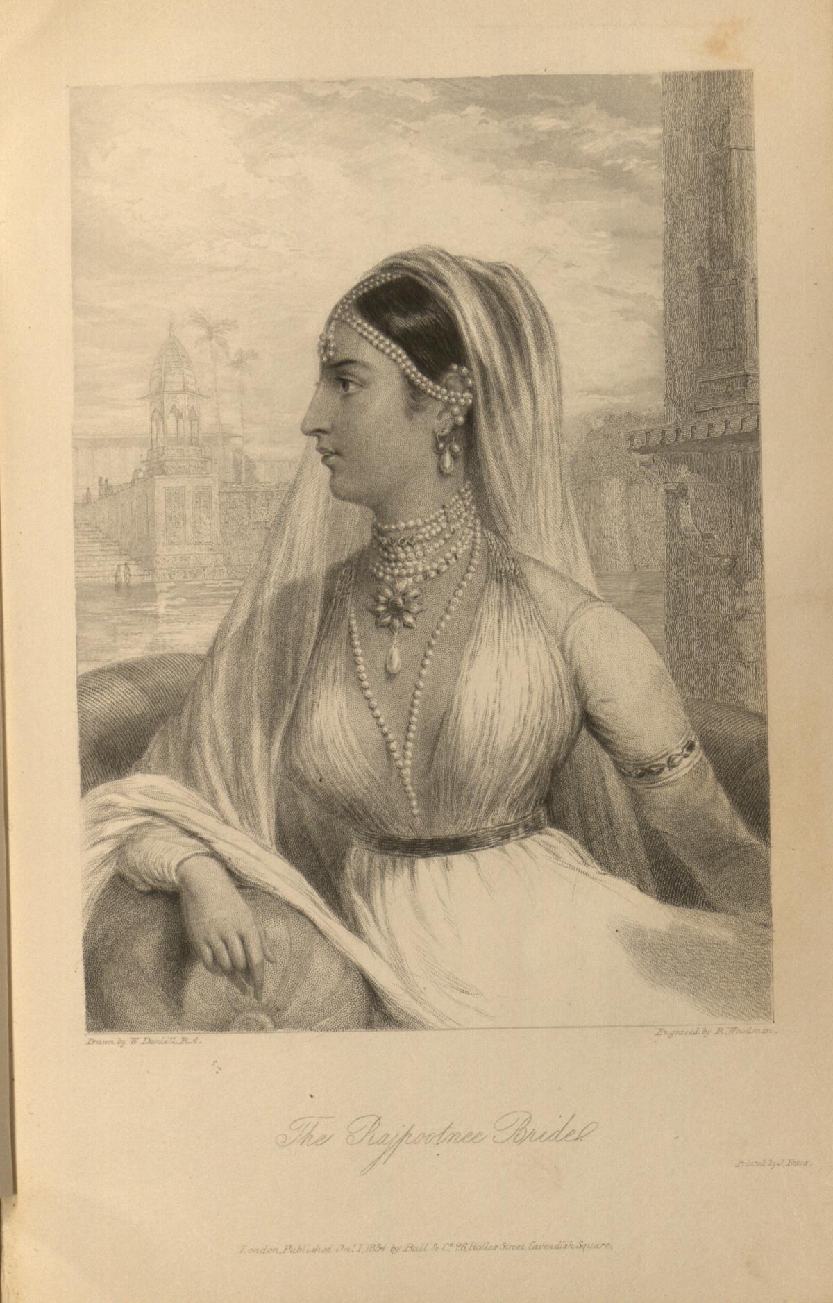 Similar to the central figure of A Hindoo Female, the subject of The Rajpootnee Bride is initially striking on account her size; the female body fills the space of the image. The image is not a portrait of a specific person, but instead gives a generic portrayal of a Rajput bride. However, because the image illustrates a story that describes the bold character and tragic fate of one such bride, this Rajput princess is depicted in such a way as to display her sexual aggressiveness. She looks away so that the viewer can voyeuristically admire her sensuality: her breasts are highlighted by the deep neck of her dress, and a string of pearls draws the eye down to her chest.3Similar to the central figure of A Hindoo Female, the subject of The Rajpootnee Bride is initially striking on account her size; the female body fills the space of the image. The image is not a portrait of a specific person, but instead gives a generic portrayal of a Rajput bride. However, because the image illustrates a story that describes the bold character and tragic fate of one such bride, this Rajput princess is depicted in such a way as to display her sexual aggressiveness. She looks away so that the viewer can voyeuristically admire her sensuality: her breasts are highlighted by the deep neck of her dress, and a string of pearls draws the eye down to her chest.