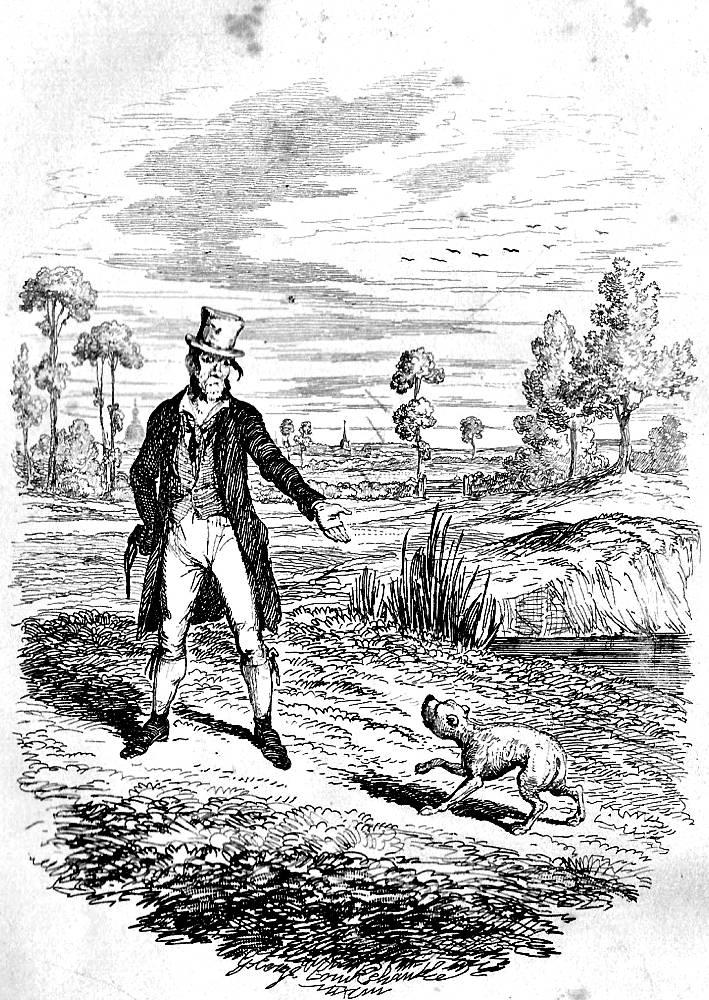 George Cruikshank, "Sikes Attempting to Destroy his Dog," for Oliver Twist, 1838, by Charles Dickens, The Victorian Web, scanned by Phillip V. Allingham. Cruikshank's image appears approximately two thirds of the way through Dickens' Oliver Twist, when criminal Bill Sikes becomes a fugitive from the law. In order to prevent his dog, Bull's-eye, from following him on the run--which would be a dead giveaway to Sikes's identity--Sikes attempts to drown Bull's-eye in a nearby pond. In this first plate of the case, Bull's-eye, who looks terrified in Cruikshank's illustration, escapes and continues to follow his master. But Bull's-eye is not simply a wandering canine: he is a symbol of Sikes's abuse and manipulation. The presence of a dog in Sikes's life acts as a mirror to Nancy, the prostitue who loves Bill Sikes, only to be killed by him. By including a dog in Oliver Twist, Dickens exemplifies how characters such as Sikes often get away with the mistreatment of not only animals, but humans. Oftentimes, we do not realize how awful a person is until we see the way they treat their dog. And even then, we sometimes learn the truth too late.