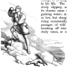 Richard Doyle, "Hans Drinks From His Flask," for The King of the Golden River , 1851, by John Ruskin, The Victorian Web, scanned by George P. Landow. There are many tests on the quest for prosperity. This lesson is not understood by Hans and Schwartz in Ruskin's literary fairy tale, The King of the Golden River. On an adventure to deliver holy water up a mountain, both unkind brothers are faced with obstacles: they are asked to give some of their holy water to dying, dehydrated creatures along their path. In one such instance illustrated in this third plate, Hans comes across a sickly dog that eyes the man's holy water in desperation. Hans refuses to give the dog any water, instead taking a drink for himself as he "spurned the animal with his foot." Hans's cruelty is abundant throughout Ruskin's fairy tale, but this rejection of a weak and dying dog hits especially hard to readers. Hans presents himself as a man not willing to help anyone, no matter how innocent or weak a creature may be. In doing so, the cruel brother affirms his fate: his quest for riches will fail, because a truly rich man finds his wealth in morality and would, therefore, cherish the life of any animal.