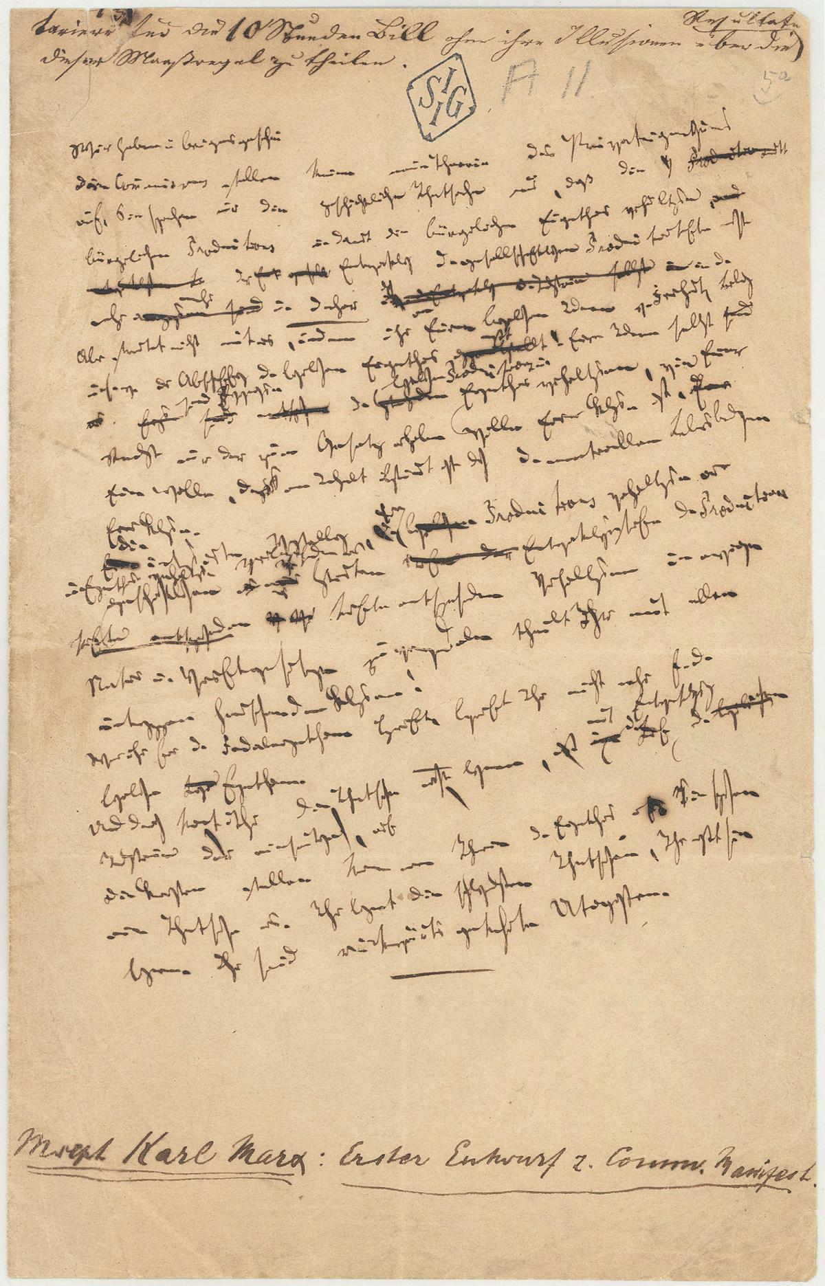 The International Institute of Social History (IISH/IISG). “Manuscript., Biographica.” First Design for the Communist Manifesto. Original in Marx/Engels Archive, A 22 (A 11)., 10 Feb. 1995, iisg.amsterdam/en/detail?id=https%3A%2F%2Fiisg.amsterdam%2Fid%2Fitem%2F698075.