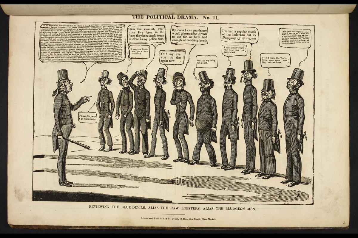 During the Victorian era, there was a growing attention and infatuation with the world of crime. In this satirical political commic from 1829, "Reviewing the Blue Devils, Alias the Raw Lobsters, Alias the Bludgeon Men", the working-class suspicion of the growing police force is depicted. The mid-nineteenth century in England was filled with debate regarding public policy and the jurisdiction the police force had. These concerns only gree when the Detective Police force was formed in 1842. These new detectives worked all hours and even would work without uniform. The public began to view the Police as agents of the upper and middle classes, and were ultimately covinced that they would take away privacy and individual liberty.