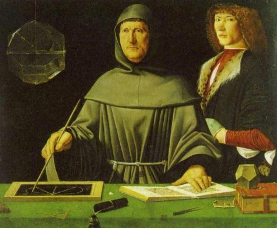 This is a portrait of Luca Pacioli with geometry equipment and an unknown figure in the background. An important feature to note is the suspended rhombicuboctahedron in the top left corner. This is the first appearance of the polyhedron (which has eight triangular faces and eighteen square faces) in a painting; notice that this painting was done before the publication of da Vinci’s geometric sketches. Since the rhombicuboctahedron is a rather complicated polyhedron, Barbari’s attempt at portraying it is imperfect; it is difficult to make out the individual faces and get a sense of the overall shape of the polyhedron (especially its backside). This painting is evidence of the fact that da Vinci’s work was no small feat. Although geometric shapes are abstract and idealized, a great deal of artistic mastery is still required to depict such figures in two dimensions.