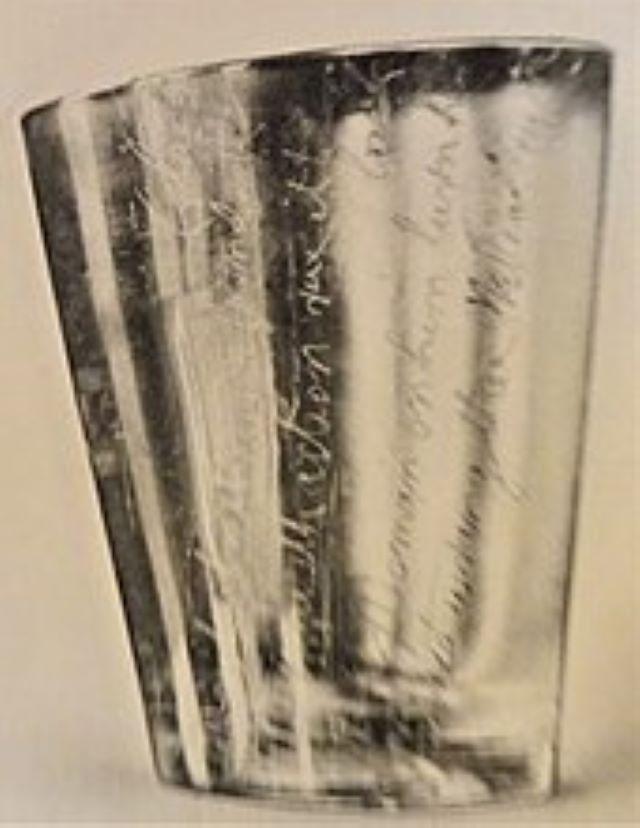 Robert Burns often engraved writings into windows and other glass items with his diamond point pen. This item, a tumbler from The Brownhill Inn, is engraved with his poem "Your Welcome Willie Stewart".