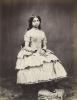 Although this photograph was taken in 1854, the Princess’s dress emulates the layered flounces popular during the 1840s (Shrimpton 12). However, the billowing pagoda sleeves that came into fashion at mid-decade and that continued in popularity into the 1850s are not featured on the Princess’s dress. The torso of the dress features ruffles and frills, however, the waistline does not appear to be tightly laced. The dress’s relatively low neckline was common for girls during the early Victorian period (Shrimpton 50). Although dresses worn off the shoulder were usually stylistically associated with adult evening wear, the Princess’s bare arms and especially bare shoulders also reflect her young age. This amount of exposed skin would usually defy the conventions of modesty, however, in the early Victorian era, dresses for young girls reflected aspects of ladies’ fashionable evening wear, including lower necklines and shorter sleeves (Shrimpton 50).