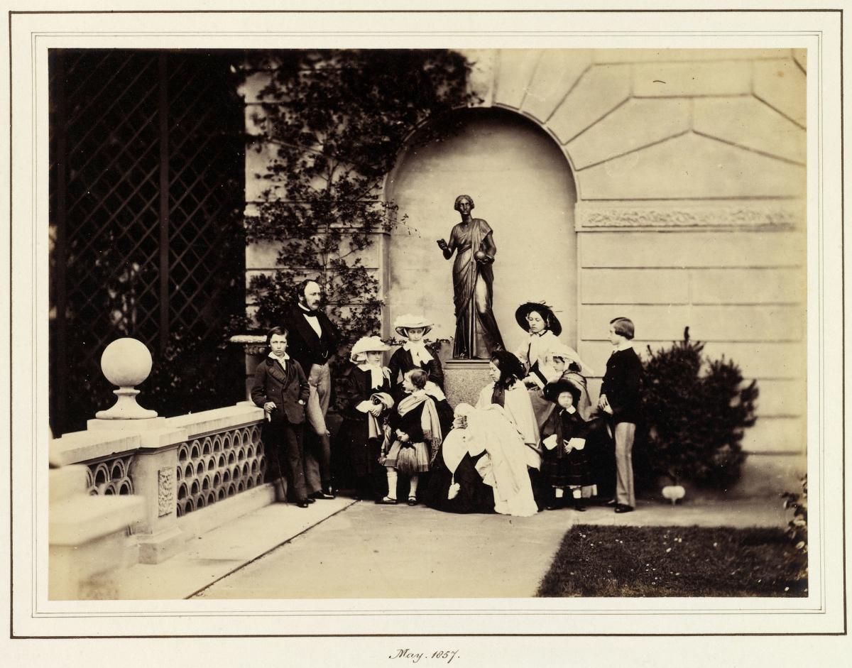 Caldesi, L. The Royal Family at Osborne May 1857 [Photograph of a group portrait of Queen Victoria and Prince Albert with their family taken in the grounds of Osborne House. The photograph depicts, from left to right, Prince Alfred, Prince Albert, Princess Helena, Princess Alice, Prince Arthur, Queen Victoria holding Princess Beatrice in her arms, Princess Victoria, Prince Leopold and Prince Albert Edward of Wales. The family pose in front of a sculpture of a full length female figure, positioned in in an alcove. There is a balustrade to the left of the group.]. Retrieved October 22, 2020, from https://www.rct.uk/collection/search#/9/collection/2106421/the-royal-familynbspat-osborne