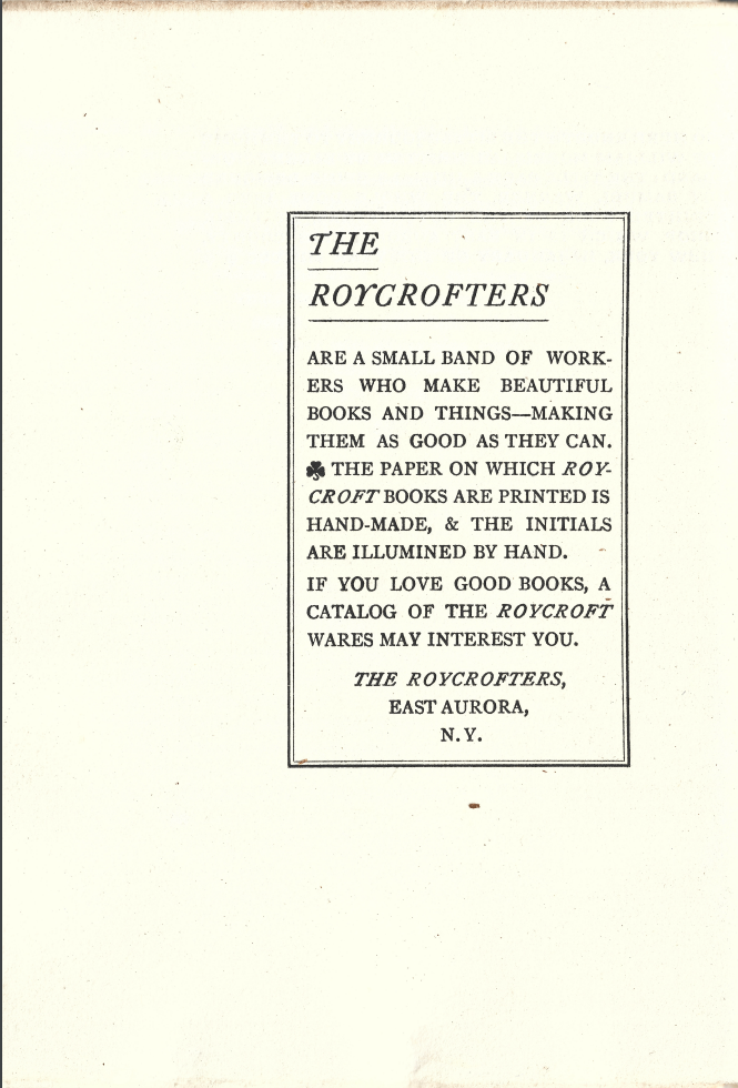 This is the second-to-last page in the book, which is a print of the Roycrofters (publisher) information. Featured in Exhibit Little Journeys to the Homes of English Authors - William Morris Copyright © Vetted? No
