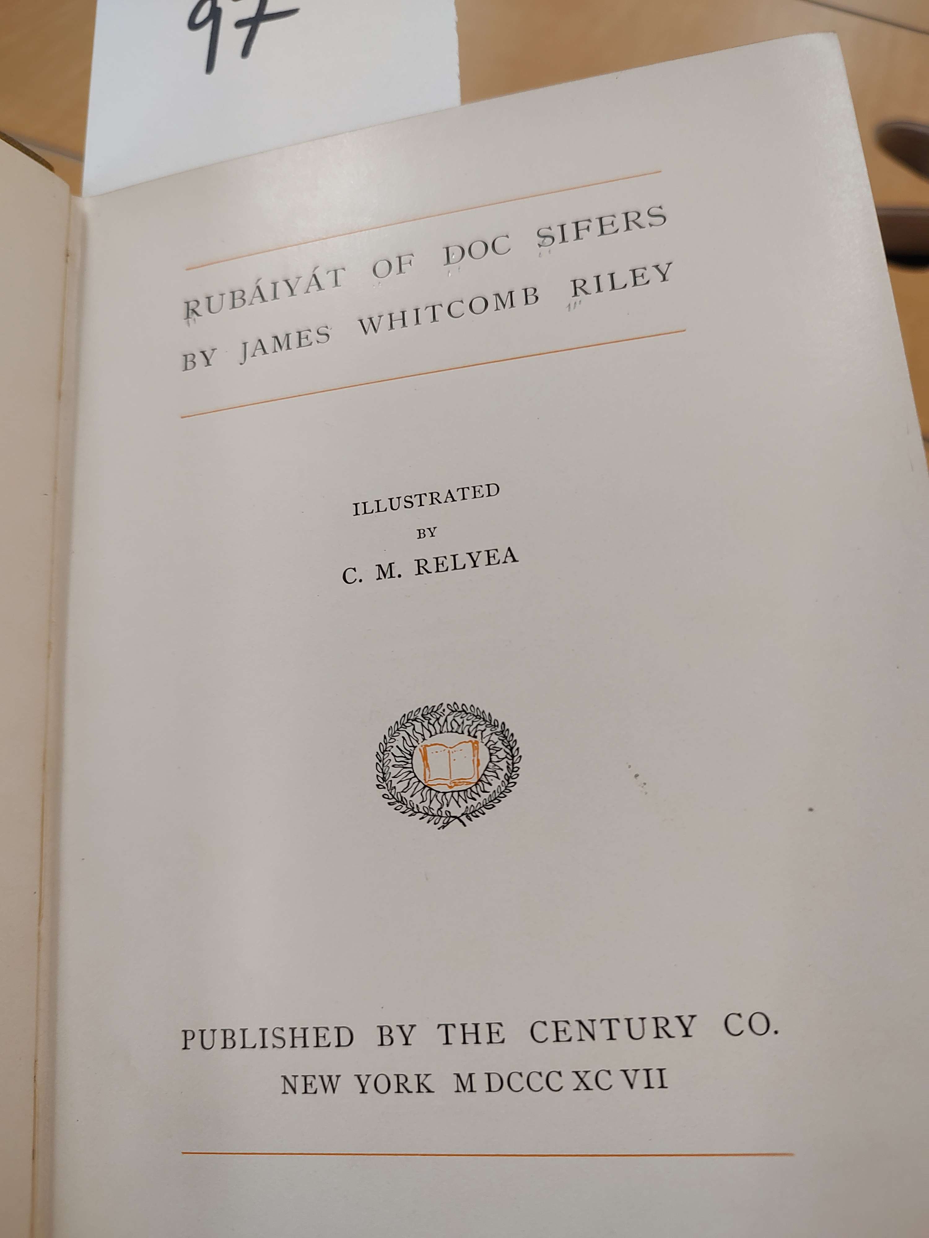This version of the Rubáiyát of Omar Khayyám is a parody named “The Rubaiyat of Doc Sifers.” It was written by James Whitcomb Riley and published by The Century Co. in 1897. James Whitcomb Riley was very popular by the time this was published, so it kind of flies under the radar of his published works. The Century Co. was also a very popular book company at the time, with many published titles under their belt. The book was illustrated by Charles M. Relyea, an illustrator from Albany, New York. Funnily enough, when he was hired to do the illustrations, James Whitcomb…