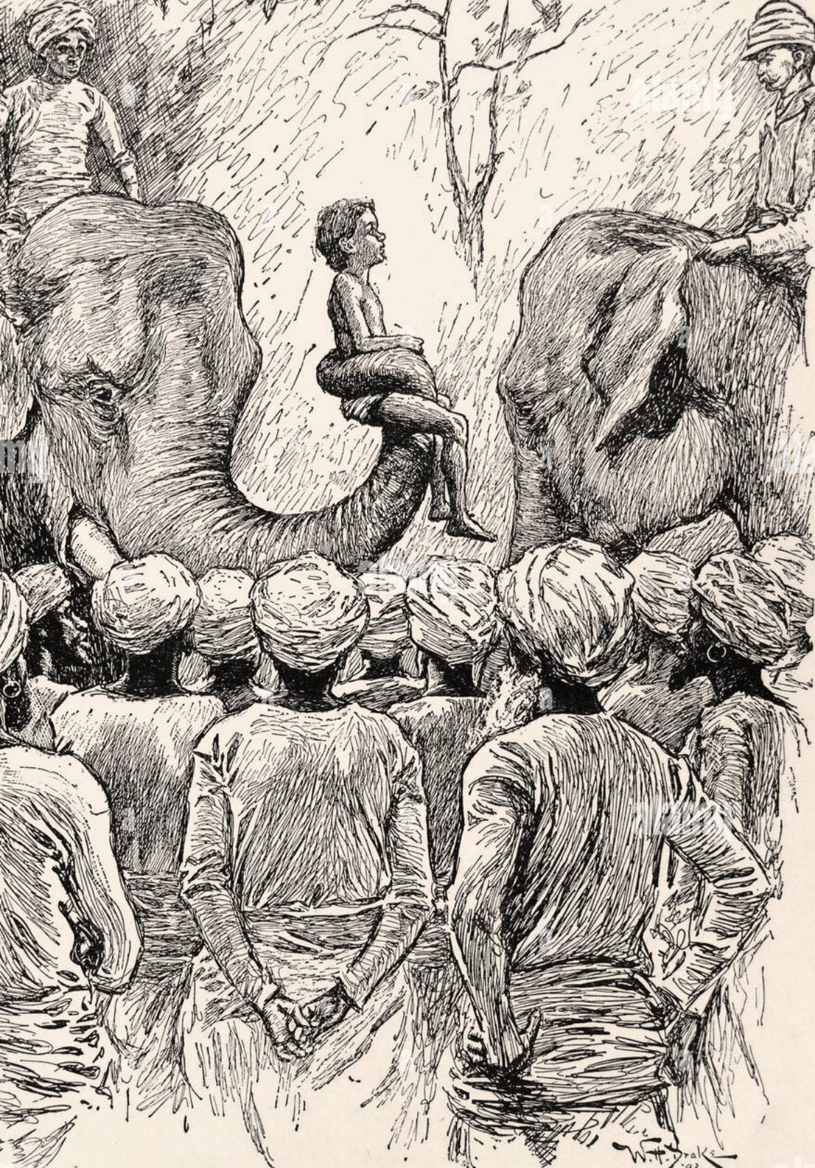 H. Drake, "Not Green Corn, Protector of the Poor, --Melons," said Little Toomai, from The Jungle Book, by Rudyard Kipling, 1894, MacMillan & Co first edition. Rudyard Kipling’s The Jungle Book is a collection of stories published in 1894 that personify a variety of jungle animals– Shere Khan the tiger, Baloo the bear, and a boy or “man-cub” named Mowgli, who is raised by wolves in Seeonee, India. For much of the nineteenth century, the British controlled a large portion of India through the East India Company, which eventually turned into a direct ruling called the British Raj in the mid-to-late 19th century. Great tensions arose between the native people of India and the British colonizers, bringing about stereotypes of savagery and disobedience. It is thought that Kipling’s children's book reflects these intricacies, masking the impositions of British imperialism on the native people within a fictitious story. The reader also follows the theme of abandonment thought to echo Kipling’s own childhood. Kipling was born in India and raised there for his early years. He was later sent to live with a foster family in England in the 1870s prior to attending boarding school. While the novel is less about the Darwinian struggle to survive that is typically found in person-creature relationship stories, it instead highlights serious and silly human mannerisms through animals. Nodding to the didactic tradition, Kipling uses his animal leaders to teach Mowgli and, in turn, the reader to respect and obey authority and know his place in the jungle as Mowgli searches for belonging and forges his identity. The story has been published in various early editions with others illustrated by Rudyard Kipling's father: John Lockwood Kipling.