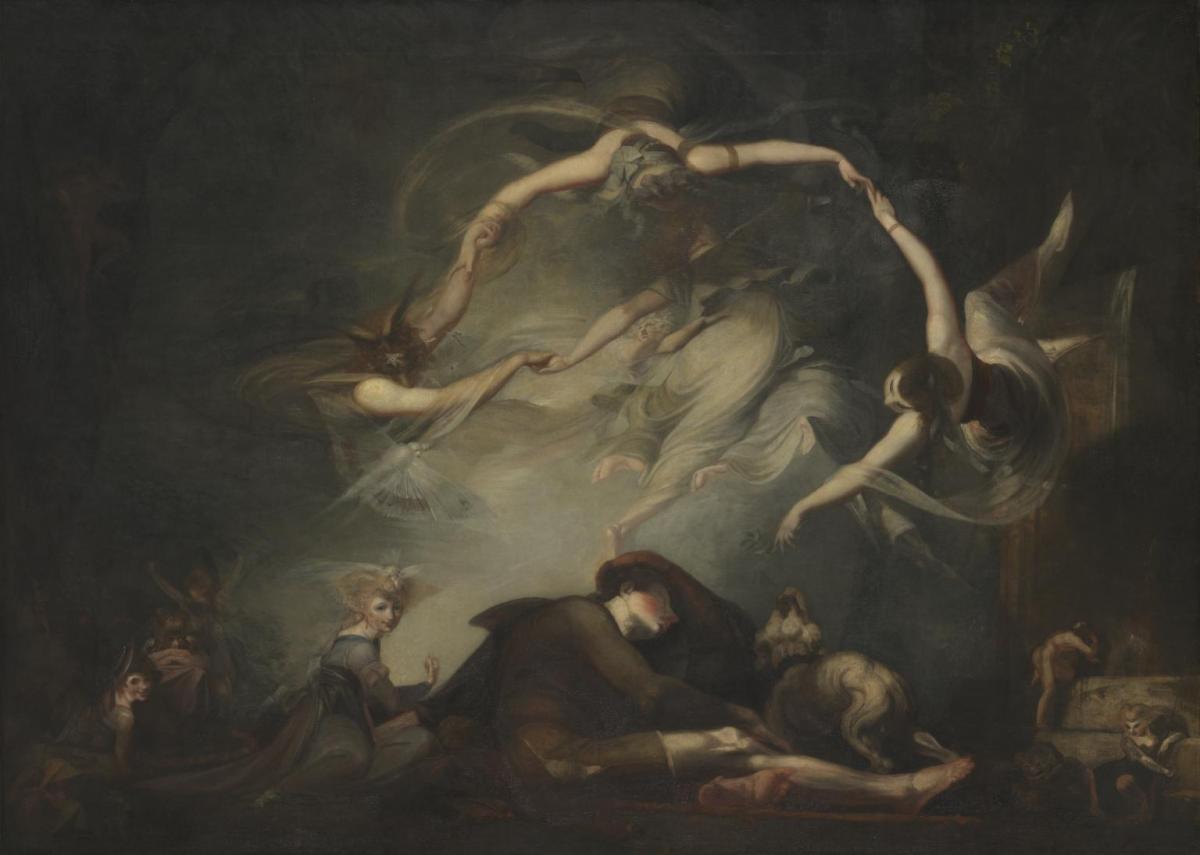 Inspired by the poem, Paradise Lost by John Milton, The Shepherd's Dream was painted by Henry Fuseli in 1793. The painting is meant to represent a moment in Paradise Lost wher Milton compares the minions of Satan (Fallen Angels) in the hall of Pandemonium - which was the central city of Hell in the poem - to that of spirtes and fairies who would seduce and bewitch passing travelers with their music: