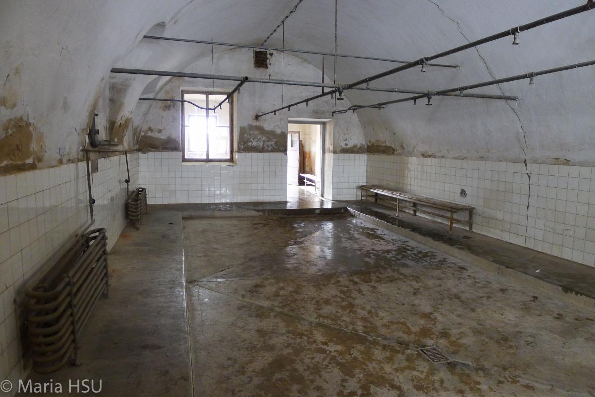 Photo depicting Terezin camp showers. We can see how people were treated like herds, in that once they were herded inside, a jet of water would start from the ceiling to wash everyone, but sometimes gas could leak out.