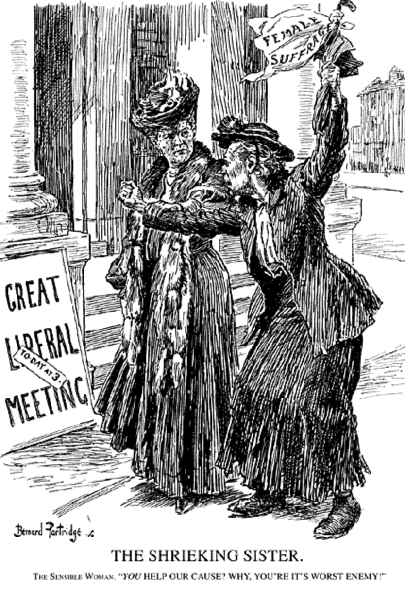 Another political cartoon that tries to disenfranchise the movement that me and my sisters are trying to spread throughout the British Isles. The Punch magazine is once again looking down on us and like their name is trying to punch the New Woman down a level. I have news for Punch Magazine; this will only motivate us to cause more havoc in the London streets and across the Isle. My so called sisters and I have even decided to adopt this name for ourselves. While I am on the topic, the shrieking sister is what I believe to be the epitome of the New Woman movement that I joined once I had become of age. My sisters and I face much criticism from not only men, but ‘Sensible Women,’ who are not true suffragists in our eyes. The ‘Sensible Woman’ may say that she wants suffrage, but at her pace we will not get suffrage until we are able to ride in a buggy from England to France; which we know will never happen. The ‘Sensible Woman’ just follows along with the normal ideals of Victorian women, and will listen if any man tells them to do something. The ‘Sensible Woman’ expects our suffragette voices to be heard by the men who have no keen interest in allowing us to participate in elections by showing that we can be respectable to their wishes. They are wrong. Without us, the Shrieking Sisters to give these men frustration and headaches; then there will be no progress made in our all out war to gain the suffrage that we rightfully deserve. The sisterhood will soon show the sensible women, the men in power and Punch Magazine that we are here to stay. We will impose our New Women values on England, and inspire women to be independent and to achieve self fulfillment.
