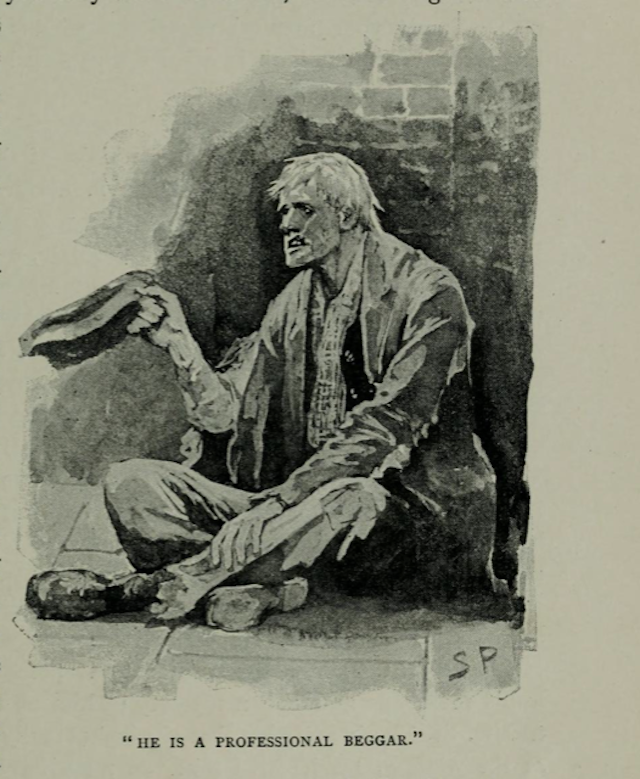 Sidney Paget illustrated this image entitled "he is a professional beggar" for Arthur Conan Doyle's "The Man with the Twisted Lip", a short story which was first published in the Strand Magazine in 1891. This is one of 56 short Sherlock Holmes stories, and is the sixth of twelve stories in The Adventures of Sherlock Holmes. This image is located off to the side of the page with text surrounding it. It is the fifth if ten black and white watercolour images that have been photographically reproduced in this short story. The illustration depicts a man sitting on the ground against the wall, holding out his cap, asking for money. The text surrounding him is a description of who we, as readers, are meant to see him as. He is described as “the sinister cripple” (138), a term often used in a derogatory way to describe disabled people. With this decription, though, Paget illustrated him as someone who looks like any other able-bodied person. It is important to note that we are supposed to view this character as someone suspicious. He is heavily involved in the drug community and he is said to be the last person to see the man Sherlock is searching for (140). Paget also illustrated him at eye level to the viewer. Even though Holmes describes him using lower-standard words, he is not illustrated from a birds-eye perspective, which would further amplify the status of Holmes to Boone. Instead, to illustrate suspicion, Paget heavily used shadows to, as it seems, surround this man, almost like an orb of dark encircling just him.