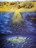 This 1936 oil painting by Ernest Smith is titled Sky Woman, and it depicts a scene from a popular Iroquois creation story which describes how the birth of two brothers, and the fall of their mother, impacted the creation of the “Great Island” (“Bookmachine”). There are many differing perspectives on how this story unfolded, but the first interpretation of this story states that, as the picture depicts, the Sky Woman lived amongst mankind on an island in the sky. The Sky Woman was pregnant with twins, but she was pushed by her husband, who was jealous of the children, into the ocean below. On her descent into the dark watery abyss, a few other sky people jumped as well to slow her fall, and these people took the form of birds and other water creatures (Mitchell 50). One of these water creatures was a turtle who swam to the bottom of the ocean to gather mud to put on its own back to cushion her fall (H.B.Z. 32).