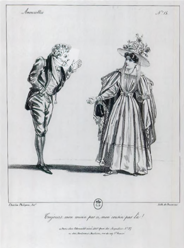 Philipon, Charles. “It’s Always ‘My cousin this, my cousin that!,’” Amourettes, 15, 1827. Lithograph. Lith. Ducarne, Dist. Ostervald l’ainé et Hautecoeur-Martinet. Bibliothéque nationale de France, Paris. (“Tonjours: mon cousin par ci, mon cousin par lá!”)