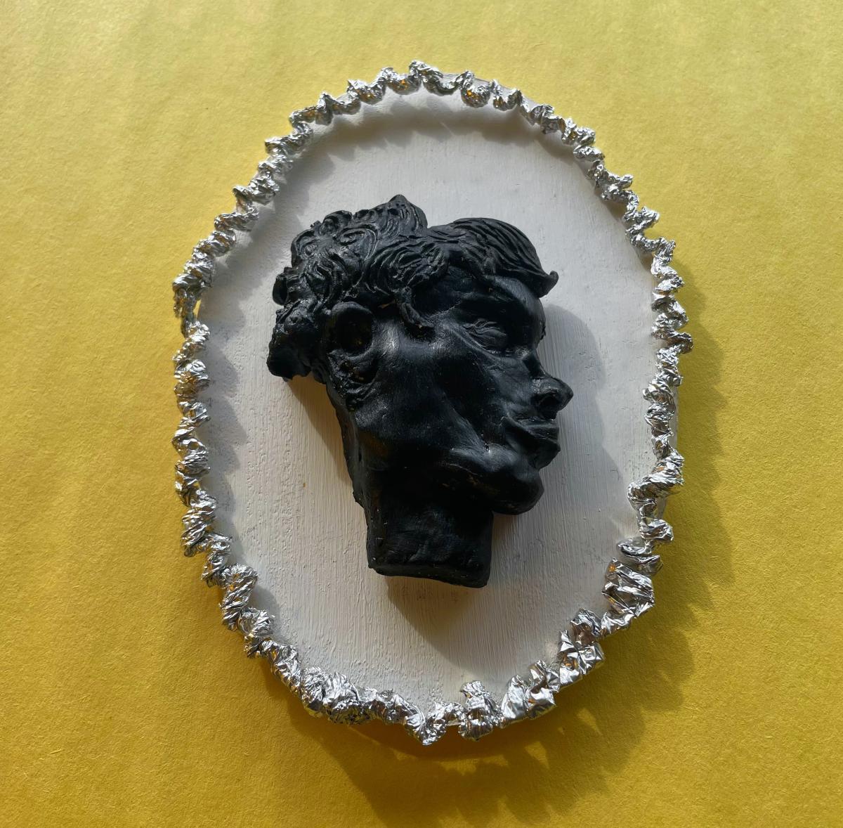 Silhouette of Charles Bingley, Crafted by Carla Crawford, 2023. This image showcases my creation of a silhouette of Charles Bingley made out of air-dry clay. Jane Austen describes his character in Pride and Prejudice (1813) as “good-looking and gentlemanlike; he had a pleasant countenance, and easy, unaffected manners.” I attempted to evoke both Bingley's handsomeness and friendly disposition in this silhouette by sculpting a temperate, humble facial expression. I also tried to give him a youthful look to reflect Bingley’s age. The decadence of the silver-trimmed frame, made from recycled tin foil, reflects Bingley’s wealth while the three-dimensionality represents his significance in Austen’s novel. As such, this silhouette both physically and figuratively conveys Bingley’s persona — a character whose privilege takes shape in his air of ease.