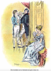 Brock, "She is Tolerable," for Pride and Prejudice (1813), by Jane Austen, 1894 edition. Charles Brock's illustration features Bingley and Darcy in Pride and Prejudice’s famous ball scene in which Darcy snubs Elizabeth through his refusal to dance. Thomson exemplifies the power dynamics of this scene: Elizabeth sits with a passive expression while she idly holds a fan — a symbol of her femininity. The two men tower over her, orienting their bodies toward each other and away from Elizabeth. Brock’s attention to Darcy’s gaze, which falls frowningly upon her, further identifies Elizabeth as the inferior “other.” This image showcases how Brock codes masculinity in the form of composition, gaze, and associations to convey its role in Austen’s world.