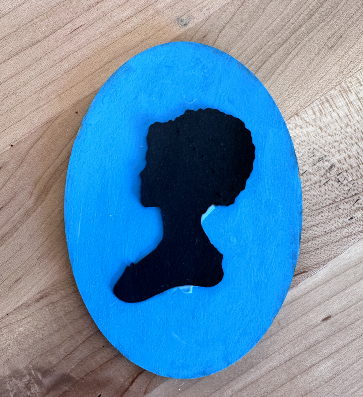 Crafting Process for Fanny Price Silhouette, Photo taken by Catherine Golden, 2023. In the photo, I am cutting out the cardstock in order to have my physical silhouette image. I then used glue to attach the picture to the light blue background on the oval wooden frame.