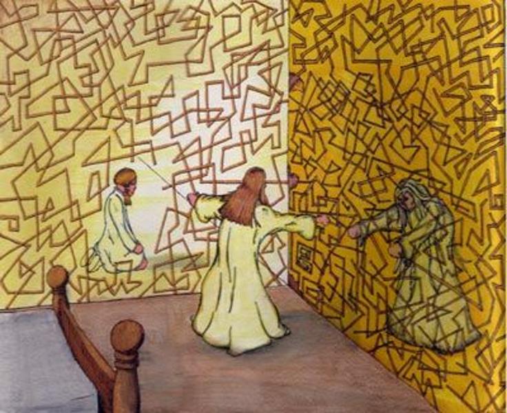 This is an illustration of the "madwoman" in the short story "The Yellow Wallpaper" by Charlotte Perkins Gilman. The image depicts the woman as she spirals into "madness" due to her prolonged enclosure in a room covered in yellow wallpaper. The woman begins to see another woman crawling inside the wallpaper, which is a representation of her own psyche. It is worth noting that she is initially locked in her room by her husband, who believes that she is exhibiting behavior abnormal to the expectations and limitations set for women in the nineteenth century.