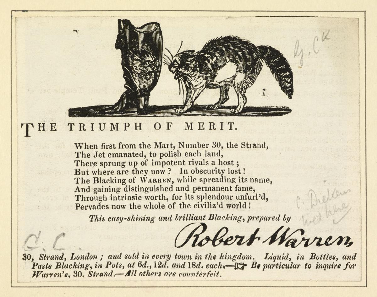 This small printed advertisement is cut from a newspaper. As typical of all of Warren’s advertisements, its header illustration is comic in tone and emphasises the blacking’s high quality: a cat bristles at the sight of its own reflection in the newly shined and blacked shoe."
