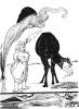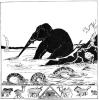 Rudyard Kipling, “The Elephant's Child Having his Nose Pulled,” 1926, from his Just So Stories, The Victorian Web, scanned by George P. Landow. This fourth plate depicts the perils of insatiable curiosity which can not only harm cats, but young elephants as well! The cunning crocodile is submerged beneath the water with just its head and snout above the surface so that it can grab hold of the elephant child’s “nose.” As the elephant struggles to free himself, his nose stretches, transforming into an elongated trunk. Though sore and unsightly, the elephant’s new trunk proves useful, and he inspires other elephants to undergo facial reconstruction. This is why “all the Elephants you will ever see, besides all those that you won’t, have trunks precisely like the trunk of the ‘satiable Elephant’s Child.” Within a smaller image below the scene from the story, Kipling includes a display of animals in pairs walking into an ark. Kipling uses images of the biblical Noah’s Ark to honor his daughter Josephine since one of her favorite toys was her Noah’s Ark play set.