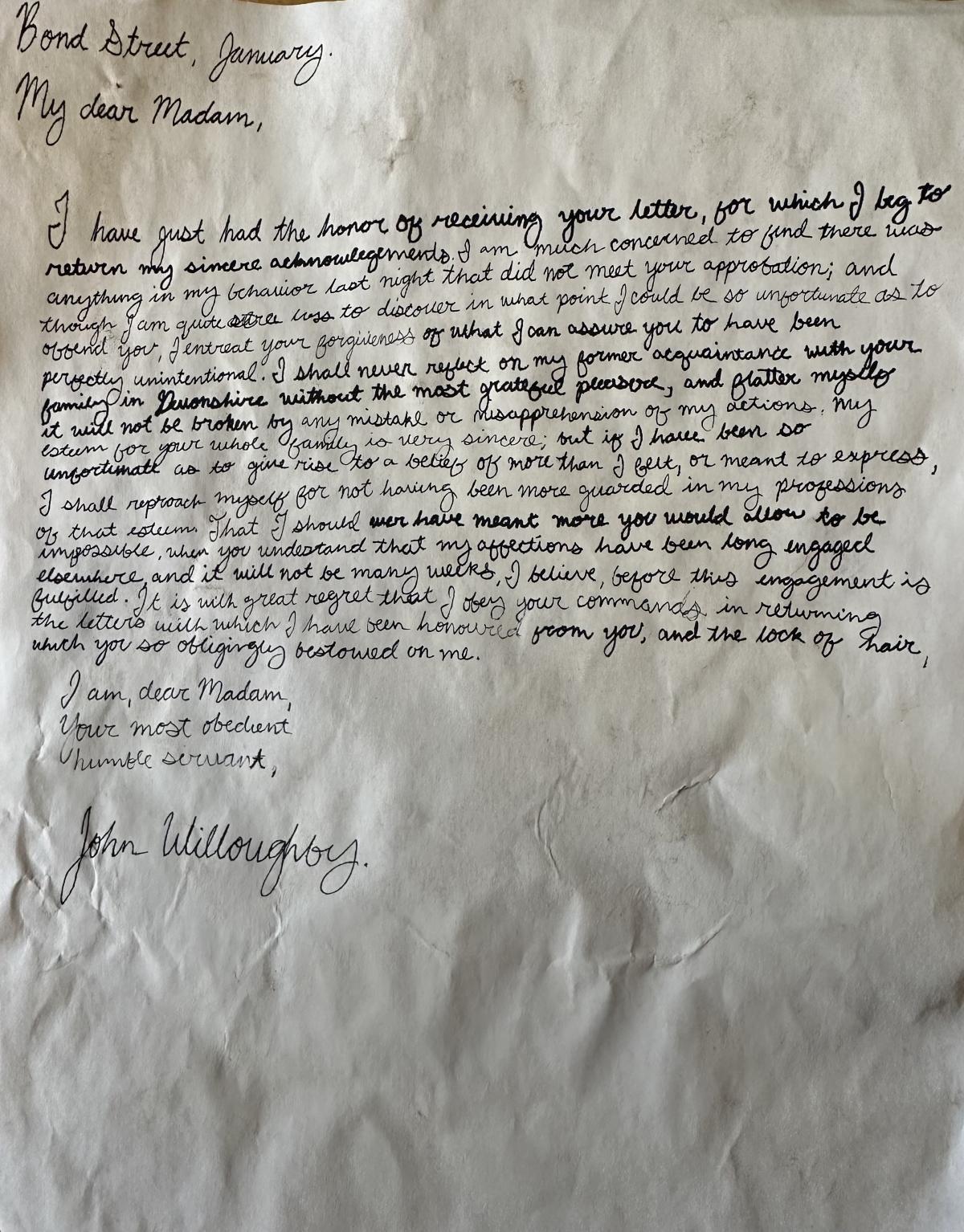 Willoughby's Letter to Marianne, crafted by Hannah Taylor, 2023