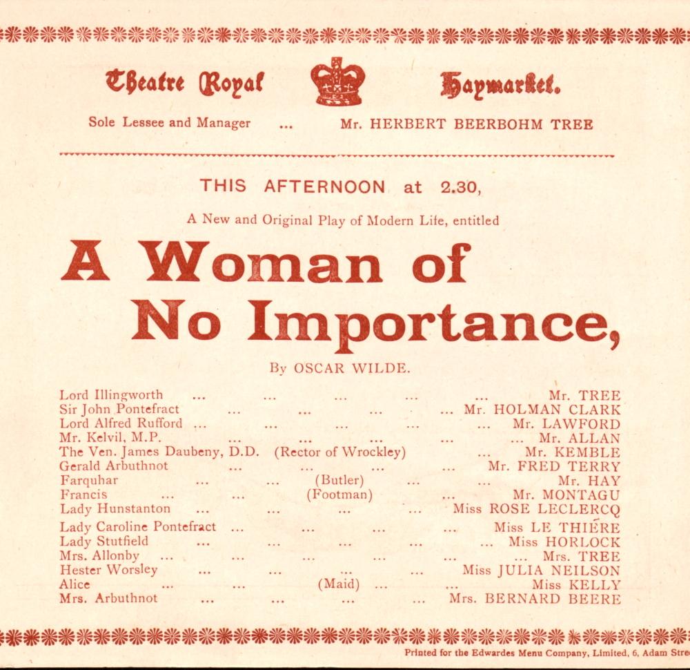 One of Wilde's many highly satirical comedic plays reveals the often troubling roles required of Victorian women. This play revolves around an unwed woman named Mrs. Arbuthnot who has a son, but is believed to be a widow. The turn of events In the story leads her son to meet and be offered a job by his biological father, Lord Illingworth, which leads him to make the decision of whether he should accept the job or show his loyalty to his mother by not taking the job. This work was published on April 19th, 1893, and first performed at the Haymarket Theatre in London.