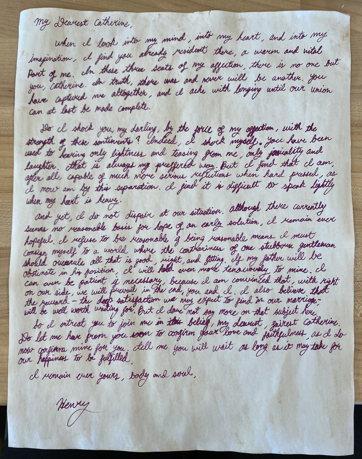 Recreation of Fan Fiction Love Letter from Henry Tilney to Catherine Morland, crafted by Emma Young, 2023. The letter has been slightly modified from Winslow's original, as I felt the opening lines were out of character for Henry, so I removed those lines. I wanted to show some love for Northanger Abbey and for Henry, which is why I chose to look past canonical letters. There aren't a miriad of letters in Northanger Abbey, and there are none between Catherine and Henry. This makes sense because for much of the novel, they live close to one another, and correspondence between the two would have been most improper.