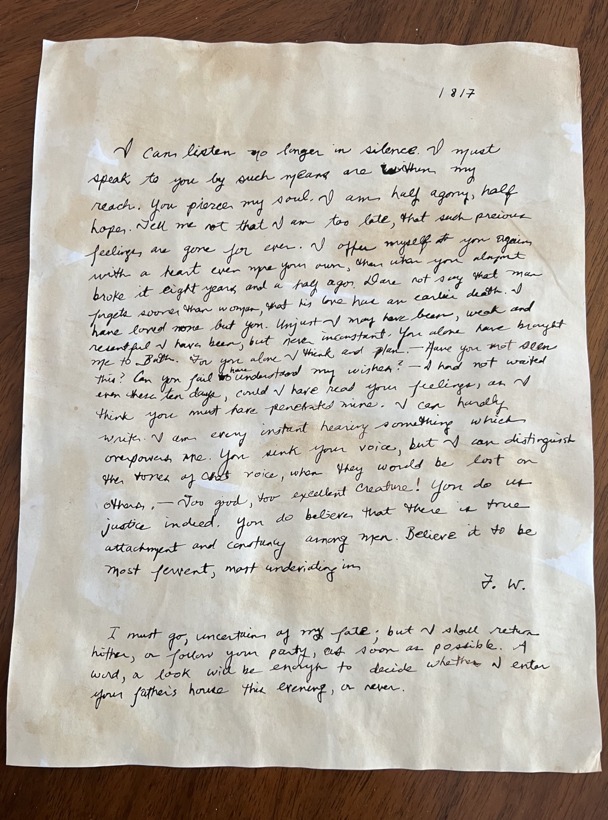 Recreation of Frederick Wentworth's love letter to Anne Elliot, Volume II, Chapter XXIII, Persuasion (1818) by Jane Austen, crafted by Catherine J. Golden, 2023. Wentworth's directness and passion became palpable as I copied this letter that makes tangible his longlasting love for Anne. Wentworth writes to Anne: "You pierce my soul. I am half agony, half hope. Tell me not that I am too late." Wentworth conveys his experiences of despair and expectation. While he uses the command form in urging Anne to admit she still loves him, Wentworth also makes himself vulnerable in placing him as the object of her "piercing" love--it is Anne Eliot who "broke" his heart eight and a half years ago and who still has the power to penetrate his soul. Striking too is how in touch Wentworth is with his emotions. He freely uses "I" often to express his love for Anne, but he also uses "you" to convey both the power Anne's love still holds over him and his attentiveness to her needs and wants: "You alone have brought me to Bath. For you alone, I think and plan. Have you not seen this? Can you fail to have understood my wishes?" As these and other lines reveal, Wentworth's well-written and thoughtful letter has sophisticated and emotion-laden diction, effective pronoun usage, and powerful use of repetition. It is also a brave letter, especially in the epitaph where Wentworth places his fate in the hands of one who refused him despite her love for him.