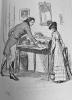 Hugh Thomson, "Placed it Before Anne," 1897, for Persuasion (1818), Volume II, Chapter XXIII. Jane Austen's novels were published in volume form without illustrations, but in the 1890s they appeared as gift book editions with color illustrations by Charles and Henry Brock and pen-and-ink illustrations by Hugh Thomson. The artist spent weeks in the British Museum and the Victoria and Albert Museum, looking at Regency fashion and furniture to guide his illustrations. Such details of furniture and fashion resonate in "Placed it Before Anne." Here we find a rolltop desk, portraits, and an ornate mirror on the walls. The artist renders their clothing in great deail from the smart cut of Wentworth's tailcoat, snug breeches, and Hessian boots (appropriate for wearing in the day) to Anne's visiting gown, lace fichu (or tucker, for modesty), feathered hat, and reticule. With just a few lines, Thomson captures the personalities of Austen's characters as well as their settings, arguably adding to Austen's fiction. This illustration responds to the lines in Volume II, Chapter XXII that read: "Wentworth] drew out a letter from under the scattered paper, placed it before Anne with eyes of glowing entreaty fixed on her for a time, and hastily collecting his gloves, was again out of the room, almost before Mrs Musgrove was aware of his being in it: the work of an instant!" Thomson shows us Wentworth's look of hopefulness as he discretely pulls out the folded letter addressed to her all the while "fixing" his gaze on the woman he still loves. Wentworth knows that a man cannot correspond with a woman unless he is engaged to her, so he uses the ruse of forgetting his gloves as excuse to reenter the room and makes great haste in drawing out the letter to protect Anne's reputation--Anne modestly does not make eye contact with him but rather looks down at the much anticipated letter.