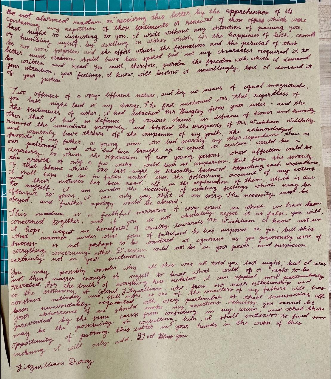 Recreation of Darcy's Letter to Elizabeth Bennet Following Her Refusal of an Offer of Marriage, crafted by Bridget Keeler, 2023. The first image in this exhibit displays the recreation I executed of Mr. Darcy's letter to Elizabeth Bennet. As that letter is quite lengthy, I shortened it by skipping over the middle of the letter where Darcy explains the stories of what actually happened between him and Wickham as well as his involvement in breaking apart Jane and Bingley. Still, Austen's writing brilliantly conveys Darcy's wit, devastation, and affection for Elizabeth in the opening and closing paragraphs. I had some minor spelling mistakes in my version, such as "ocassion" instead of "occasion" in the first paragraph.