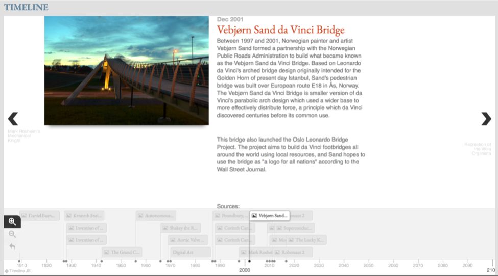 As you can see, this particular student (Emily Maneke, a triple major in Building Information Modeling, Virtual Product Integration, and Computer Graphics Technology) was interested in Leonardo’s bridge designs. The timeline allowed her to research the history of bridge-building in preparation for her final paper, on Leonardo’s own designs. Her own mini-timeline culminates with Vebjørn Sand’s implementation of Leonardo’s parabolic arch design, originally intended for the Golden Horn of present-day Istanbul (Fig. 4).