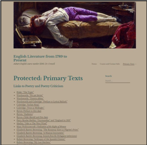 English 2240-003 Fall 16 (British Literature Since 1789: Romance, Revolution, Realism) was the first course to use COVE’s Annotation Studio. As such, it represents the first attempt to adapt what was originally used as a publication medium directly into the classroom as a teaching tool. My students were some of the very first users to test our software as it stands. I combined Annotation studio with two other web-based content delivery systems: Auburn University’s Canvas content management system (CMS), and a website I created specifically for the course. My goals for this first COVE-based course were threefold: first, to beta test COVE Annotation Studio and test its effectiveness as a multi-user classroom technology; second, and most importantly, to add an element of interest to the act of reading by showcasing British Literature using emerging technologies; and lastly, to save my students money.