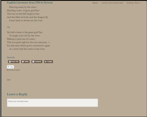 Because this essay emphasizes how students learn to access ideas and texts between media, I focus on two specific texts annotated in the studio: Percy Bysshe Shelley’s “Ode to the West Wind,” and Elizabeth Barrett Browning’s “A Musical Instrument,” both of which are fundamentally interested in trans-medial communication. Shelley’s poet speaker asks, literally, for inspiration from the West Wind to transform his voice. EBB, using the figure of the reed pipe, writes of the violence involved in translating life into art.